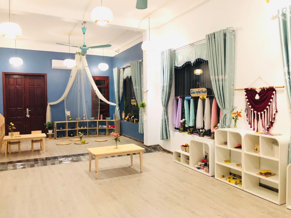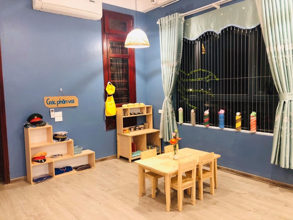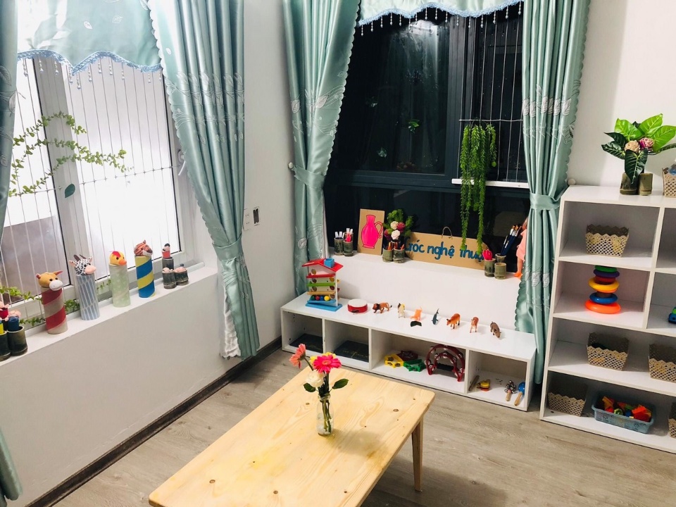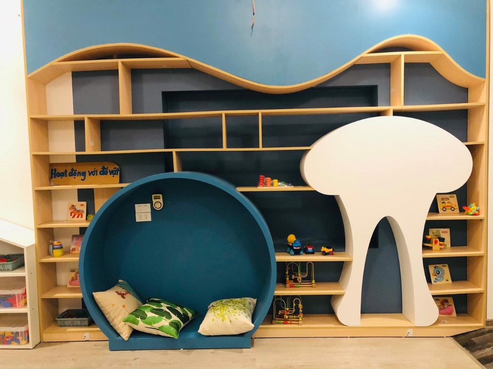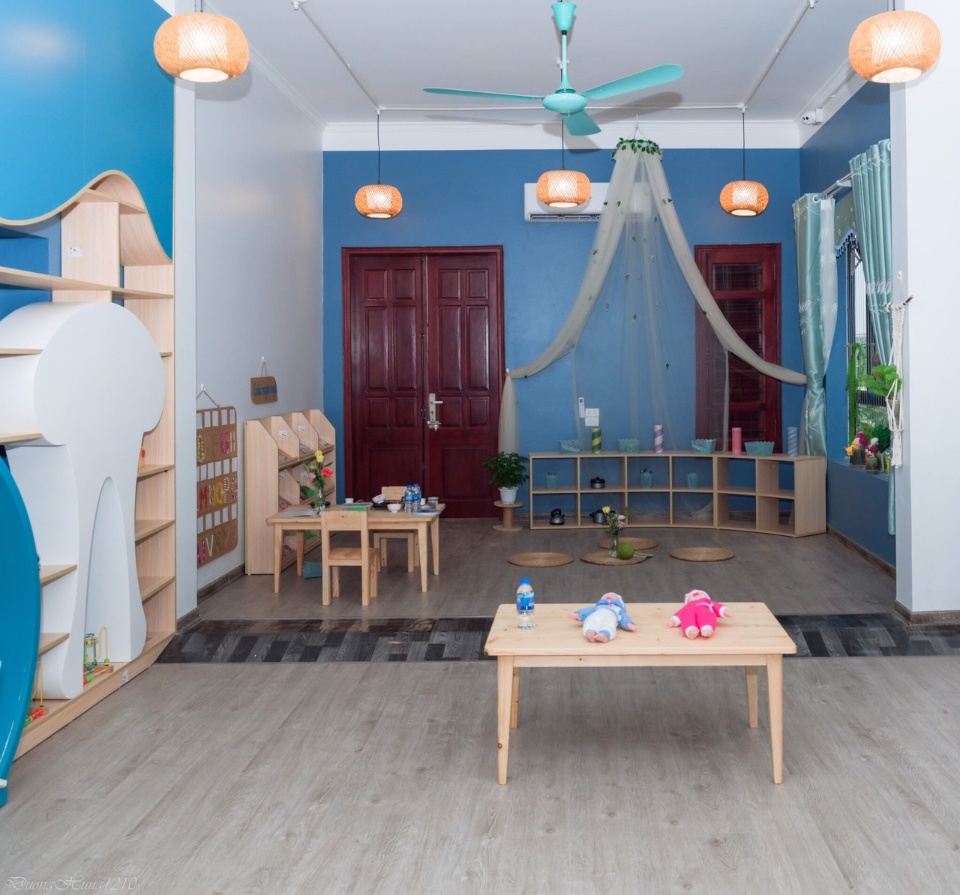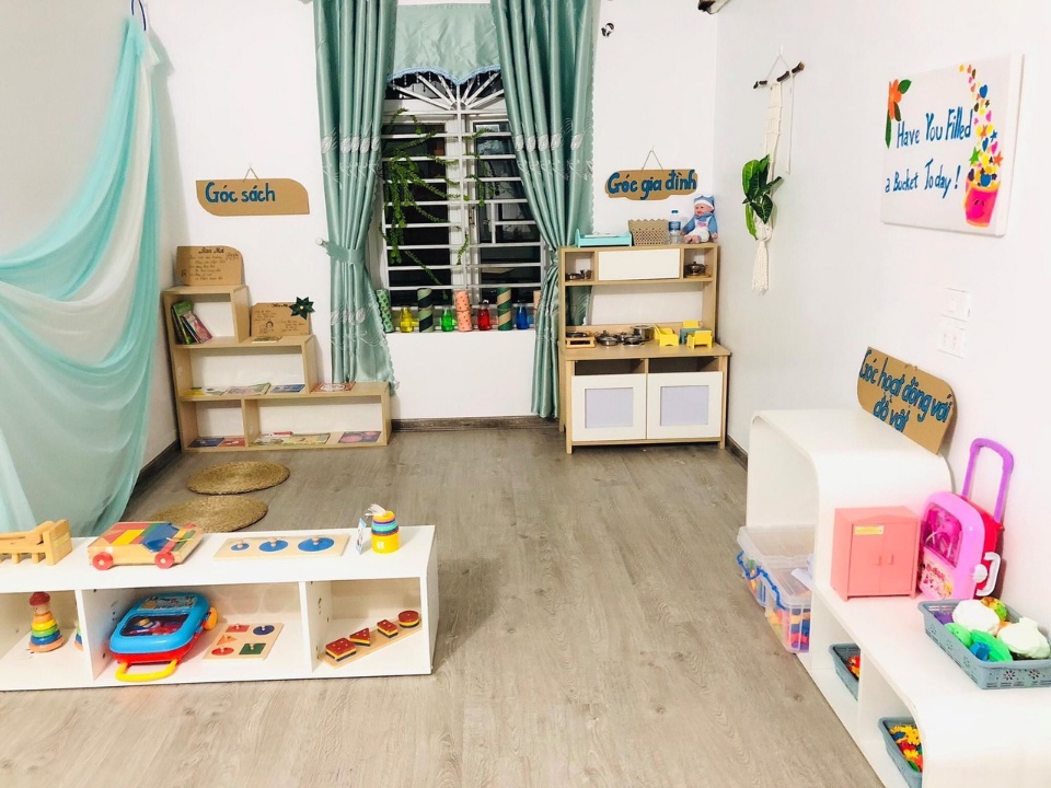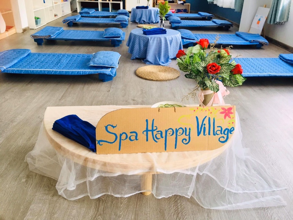 Happy Village có không gian lớp học rộng, thoáng sạch, được thiết kế hiện đại, môi trường học tập mở với nhiều cách trưng bày học liệu khác nhau để con trải nghiệm. Đồng thời điều kiện cho phụ huynh được tham gia vào cả quá trình học tập của con.